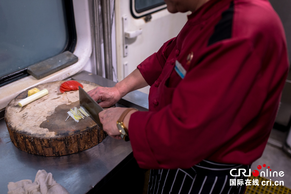 列車上的廚師和一般的餐廳廚師最大的區別在于“晃”,火車在運行中顛簸不斷,“最重要的是腿要分開,站成外八字,扎好馬步,隨著車廂晃動的方向,這樣才能穩當?!卑讕煾嫡f。