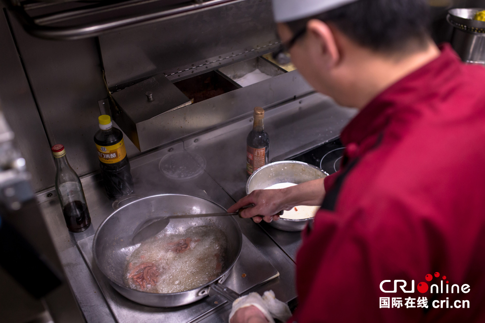 “5份杭椒牛柳套餐,哥幾個都忙起來啊,牛柳可以多滑點?!卑讕煾嫡泻糁鴱N房里的兩個老搭檔。杭椒牛柳是這趟車點單率比較高的套餐之一。