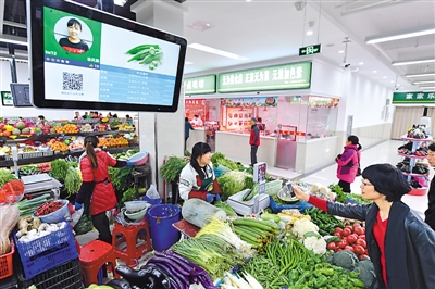 安徽省合肥市瑤海區勝利智能農貿市場,每個攤位都安裝了電子屏,只需掃碼即可實現移動支付,還可在平臺對商家進行點評、維權投訴等。掃碼“滴”聲之后,現實與虛擬被連接,這種黑白方格組成的“時代符號”(二維碼)帶來了便利、快捷和驚喜?!埓髰彅z(新華社發)