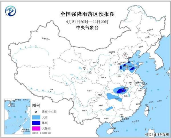 中央氣象臺4月21日18時繼續發布暴雨藍色預警: