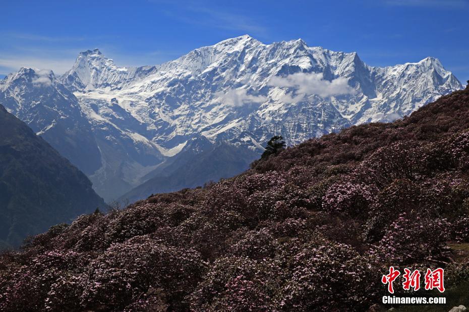 吉隆溝給人最大的感受是驚訝于造物的神奇,讓四季并存在這狹小的山谷間。峽谷綠樹成蔭,恬靜的村莊被綠樹環抱著,不遠處能清楚地看見若隱若現的雪山。圖為杜鵑花與尼泊爾朗塘雪山交相輝映。 楊建 攝