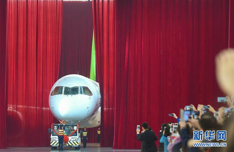 我國自主研制的C919大型客機首架機,在中國商飛公司總裝制造中心浦東基地廠房內正式下線(2015年11月2日攝)。 新華社發(裴鑫 攝)