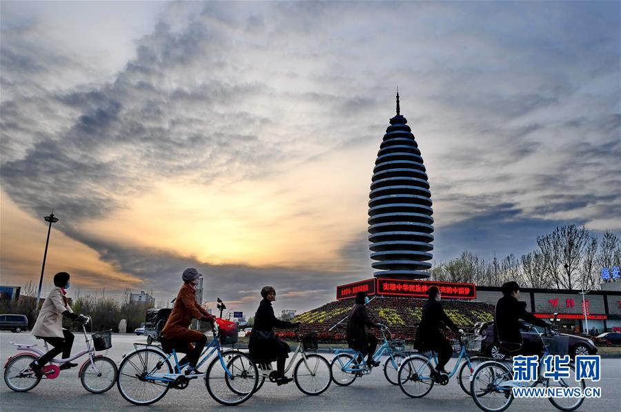 市民在河北雄安新區容城縣縣城道路上騎行(3月29日攝)。 新華社記者 牟宇 攝