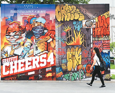 圖為游客走過青島紡織谷涂鴉宣傳畫前。 王海濱攝(人民視覺)