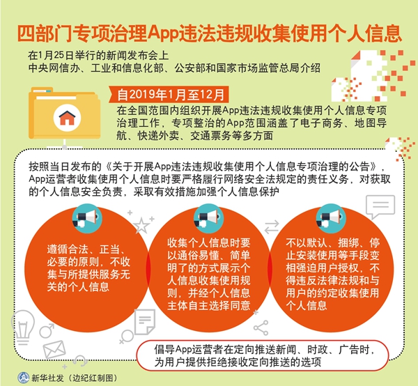 按照當日發布的《關于開展App違法違規收集使用個人信息專項治理的公告》,App運營者收集使用個人信息時要嚴格履行網絡安全法規定的責任義務,對獲取的個人信息安全負責,采取有效措施加強個人信息保護。遵循合法、正當、必要的原則,不收集與所提供服務無關的個人信息;收集個人信息時要以通俗易懂、簡單明了的方式展示個人信息收集使用規則,并經個人信息主體自主選擇同意;不以默認、捆綁、停止安裝使用等手段變相強迫用戶授權,不得違反法律法規和與用戶的約定收集使用個人信息。倡導App運營者在定向推送新聞、時政、廣告時,為用戶提供拒絕接收定向推送的選項。