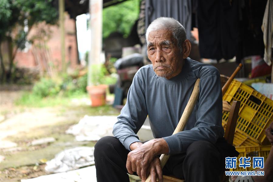 全州縣鳳凰嘴渡口旁,蔣濟勇老人向再走長征路的記者們講述自己11歲經歷的湘江戰役(6月29日攝)。新華社記者 周華 攝