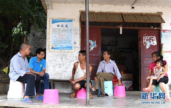 楊杰興(左)在廣西樂業縣百坭村與村民班龍排拉家常(8月1日攝)。新華社記者 周華 攝