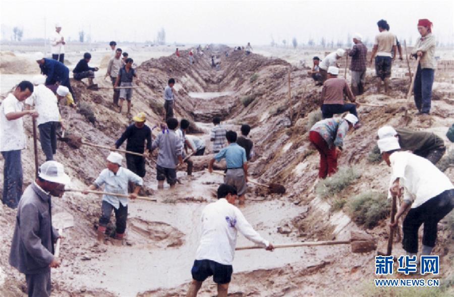 永寧縣閩寧鎮建設初期,群眾在進行農田水利建設。攝于1997年7月。 新華社發