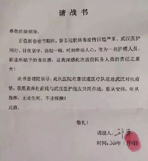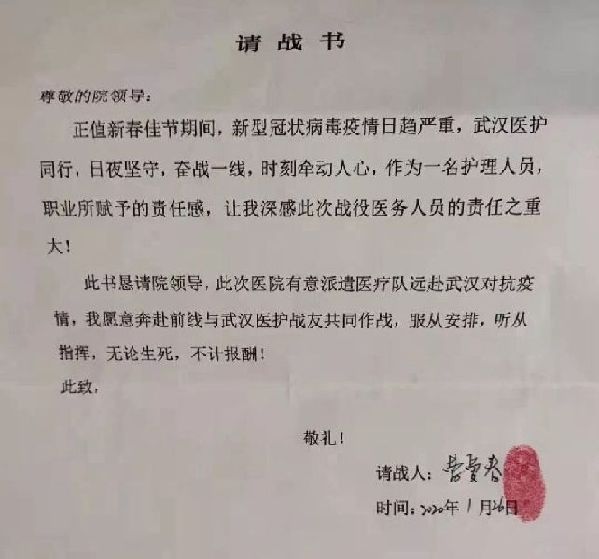 甘肅省定西市人民醫院新生兒科護士長曹愛春和護士邢亞半夜寫下請戰書,懇請院方批準奔赴一線。落款時,兩人寫了八個字:無論生死,不計報酬。(定西市人民醫院供圖)
