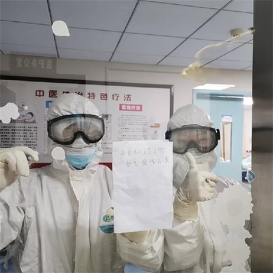 ▲防護包得嚴嚴實實,進入病房后,大家用紙筆交流。