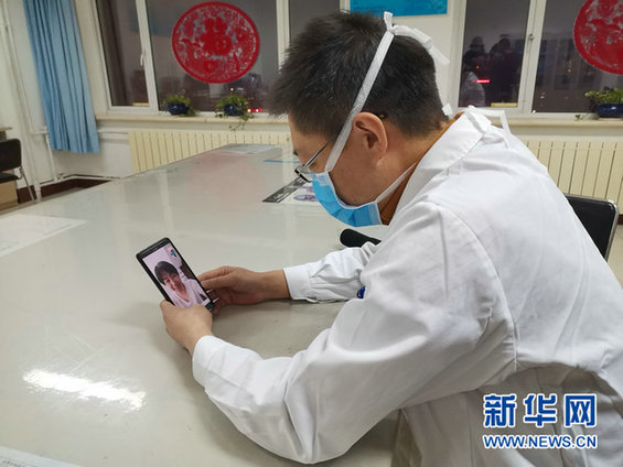 2月1日晚,王旭光和妻子李莉在視頻通話。(新華網曹楨攝)