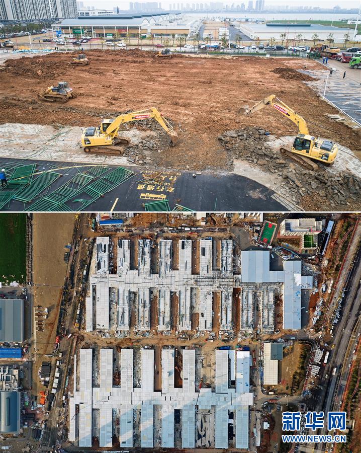 這是一張拼版照片:上圖是1月26日拍攝的武漢雷神山醫院建設工地(無人機照片,新華社記者肖藝九攝);下圖是2月5日拍攝的武漢雷神山醫院建設工地(無人機照片,新華社記者李賀攝)。新華社發