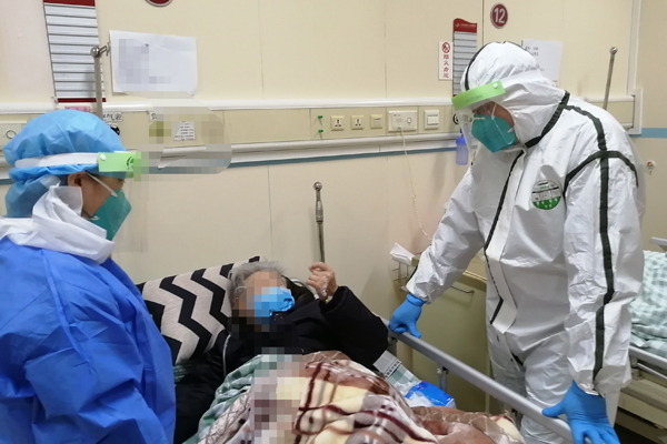 2月12日,全國人大代表、中央指導組專家組成員、中國工程院院士、天津中醫藥大學校長張伯禮(前排左三)在湖北武漢江夏方艙醫院指導工作。