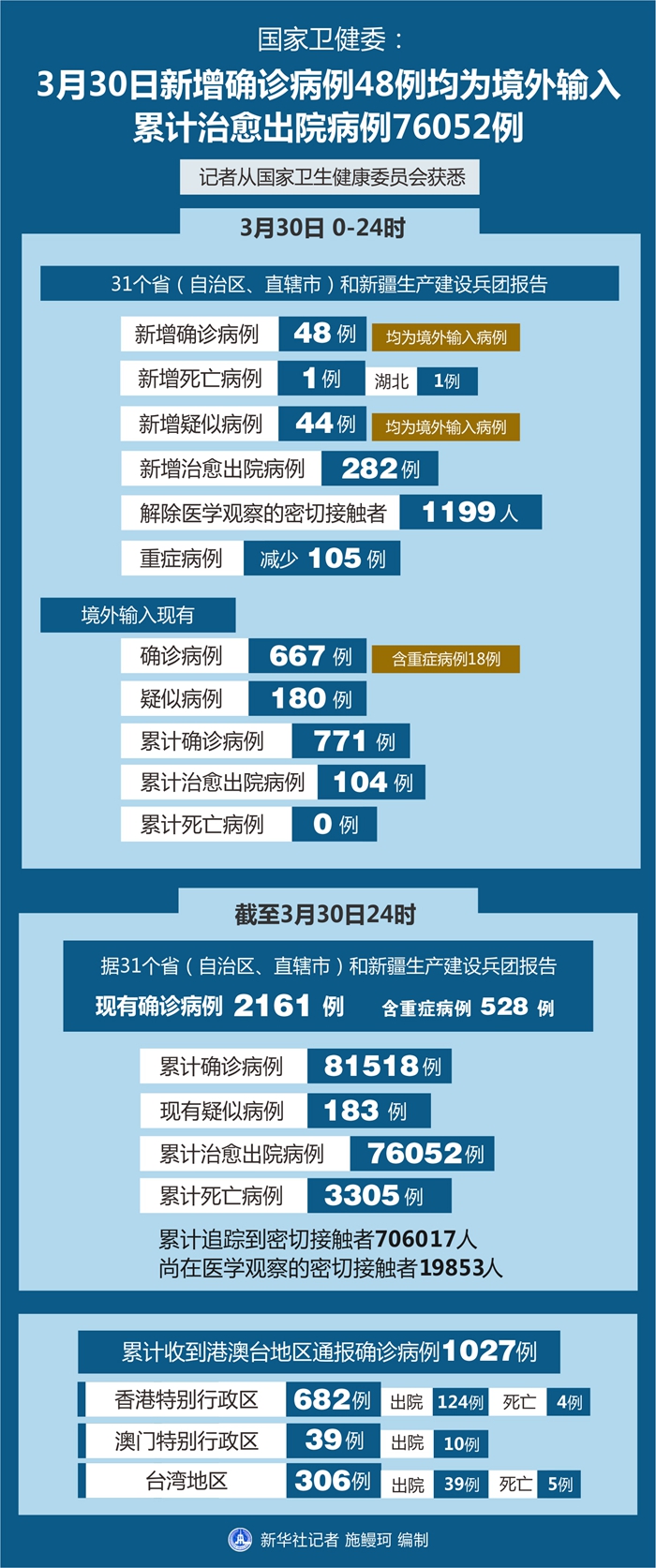 新華社北京3月31日電(記者劉羊旸、王秉陽)記者31日從國家衛生健康委員會了解到,3月30日0—24時,31個?。ㄗ灾螀^、直轄市)和新疆生產建設兵團報告新增確診病例48例,均為境外輸入病例;新增死亡病例1例(湖北1例);新增疑似病例44例,均為境外輸入病例。
