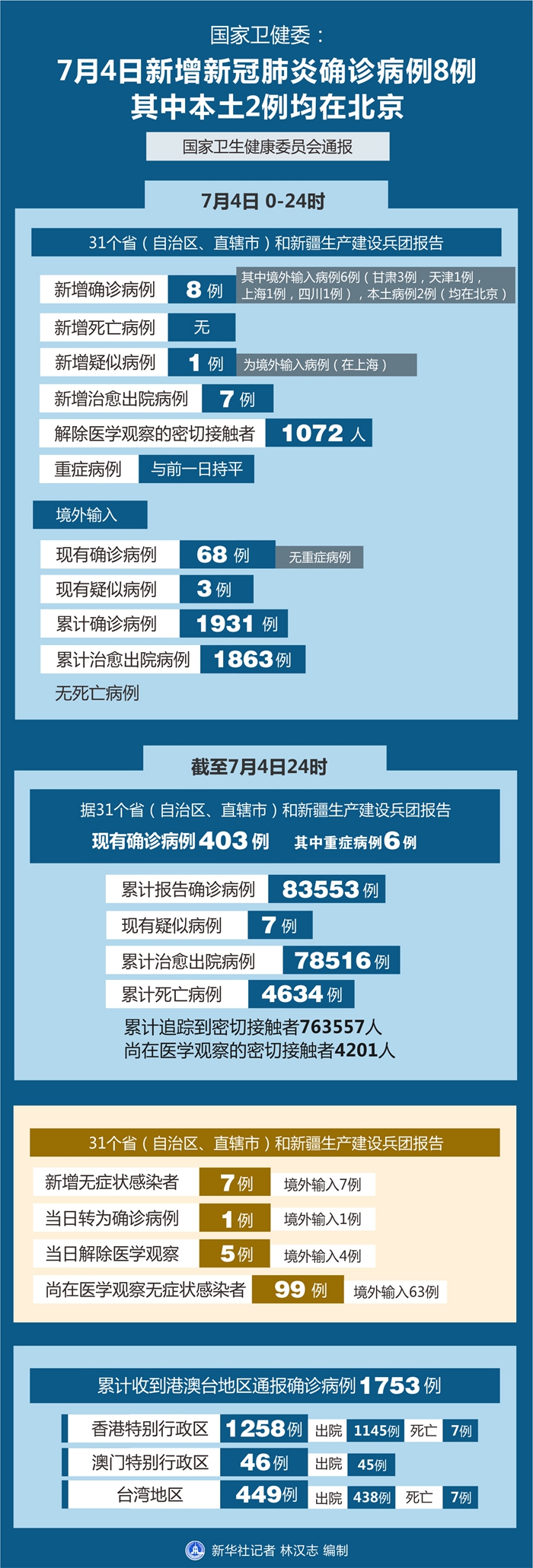 新華社北京7月5日電(記者屈婷)國家衛生健康委員會7月5日通報,7月4日0—24時,31個?。ㄗ灾螀^、直轄市)和新疆生產建設兵團報告新增新冠肺炎確診病例8例,其中境外輸入病例6例(甘肅3例,天津1例,上海1例,四川1例),本土病例2例(均在北京);無新增死亡病例;新增疑似病例1例,為境外輸入病例(在上海)。