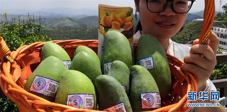 在廣西百色市田陽區20萬畝農林生態脫貧產業核心示范區,一名工作人員在展示獲得“圳品”認證的百色芒果(7月14日攝)。新華社記者 周科 攝