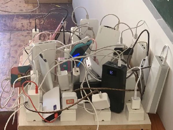 每間教室的講臺旁邊都放著一排插線板,上面插滿了充電寶。據學生介紹,學校封禁了宿舍內的插電孔,他們只能將充電寶在教室充滿電后帶回宿舍用?!坝袝r候教室里充電的地方滿了,要么排隊,要么去超市花錢充?!庇捎谒奚釠]插電孔、沒網,這里的大學生幾乎沒人用電腦。小許說,學校說宿舍不能充電是為了防火安全,但是如此管理未免太過“簡單粗暴”。