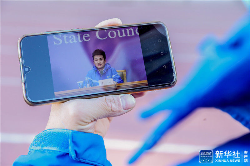 12月16日,李杰在展示他在參加國務院聯防聯控機制新聞發布會時的照片。新華社記者 張玉薇 攝