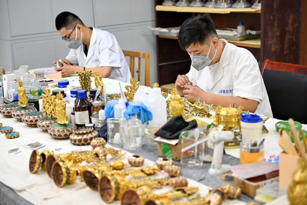 2025年5月30日,文保工作人員在承德避暑山莊博物院修復琺瑯器。