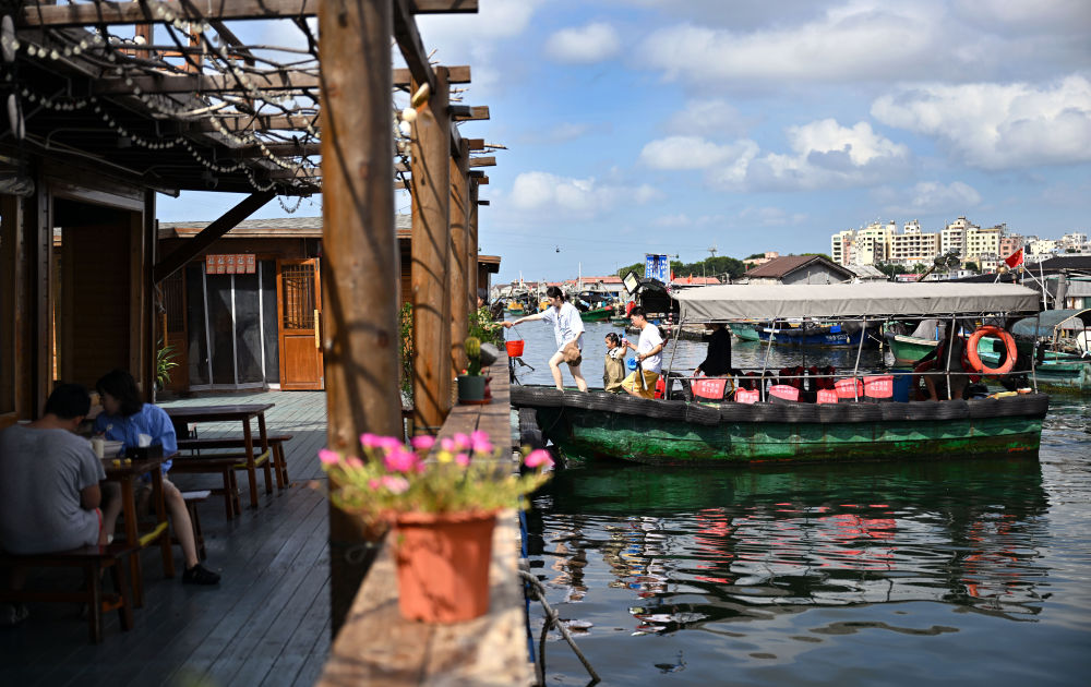 2023年10月3日,在海南陵水黎族自治縣新村港,游客乘坐接駁船抵達海上漁排民宿,體驗特色旅游資源。