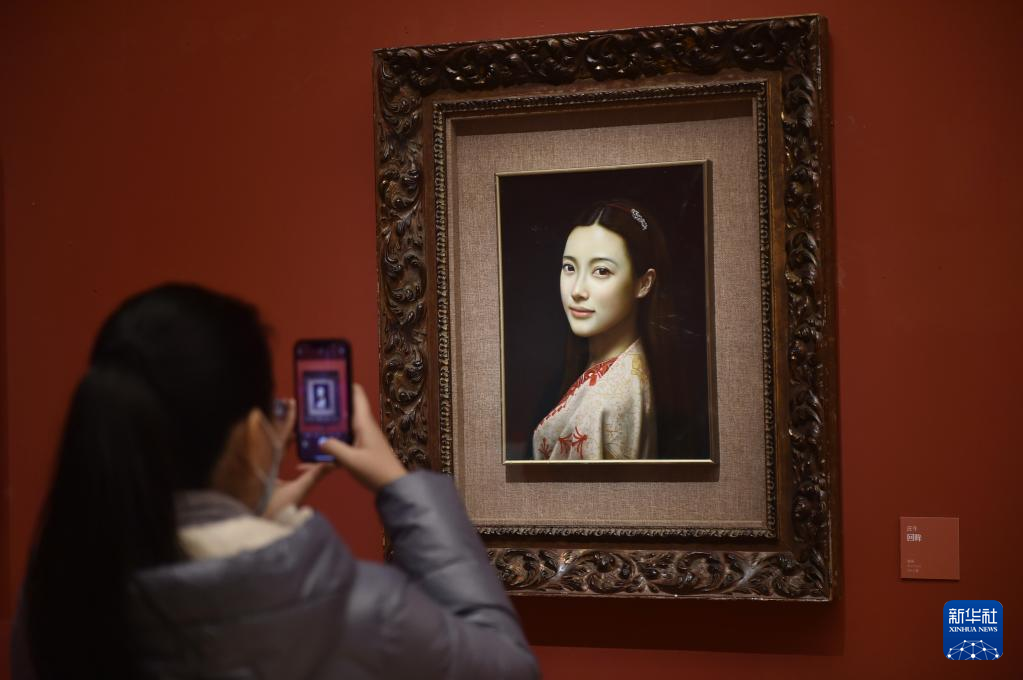 1月22日,參觀者在中國美術館拍攝“美在致廣——全國小幅美術精品展”中的展出作品《回眸》。新華社記者 魯鵬 攝