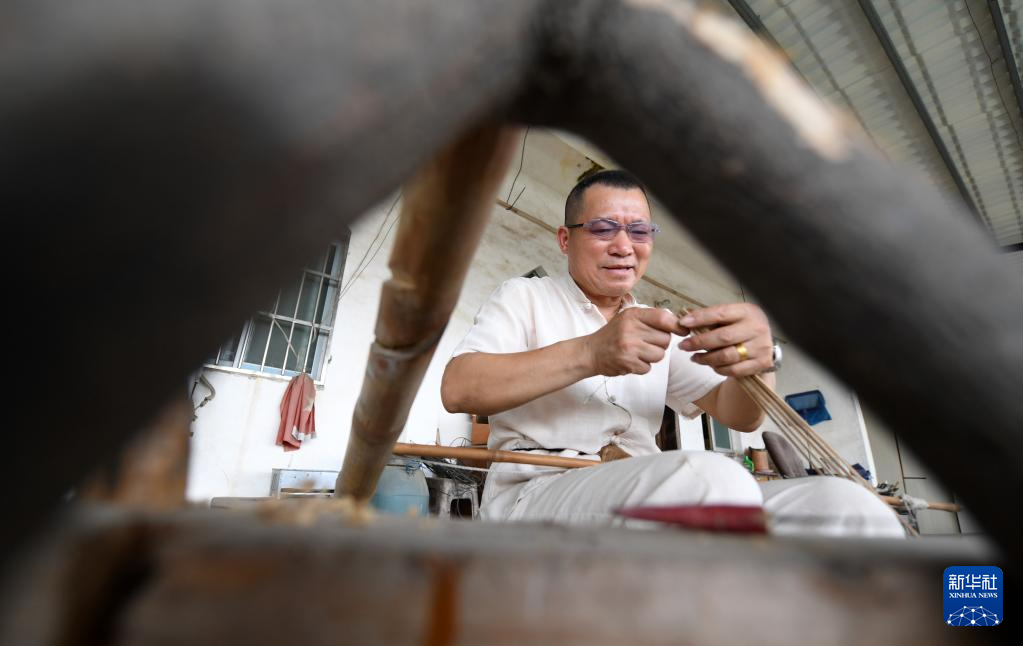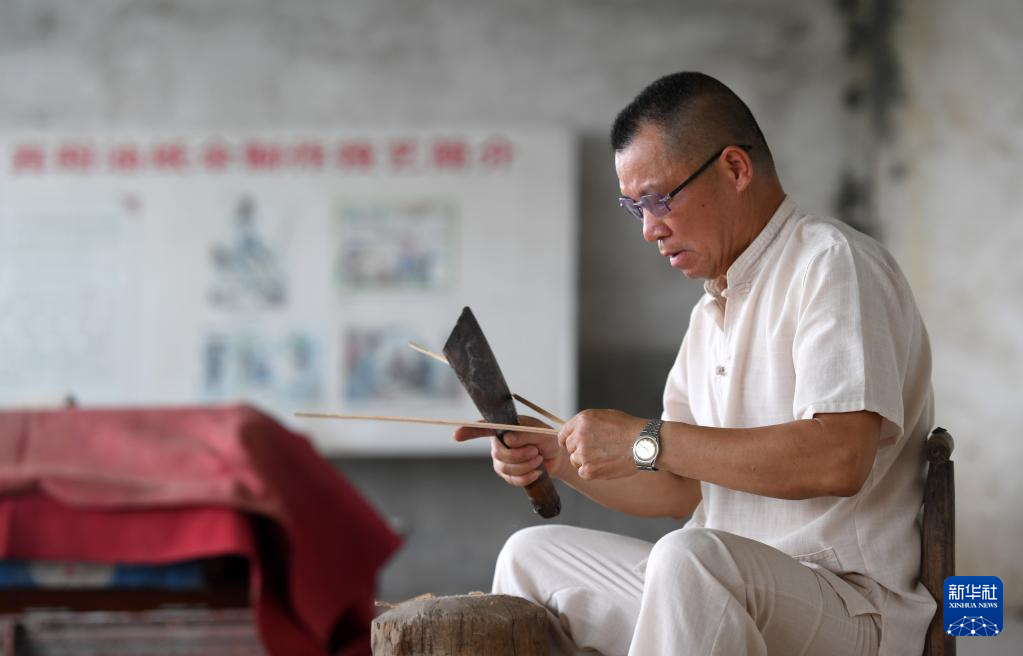 6月1日,在廣西賓陽縣賓州鎮陸村,陸云崗在剖竹篾準備制作油紙傘。
