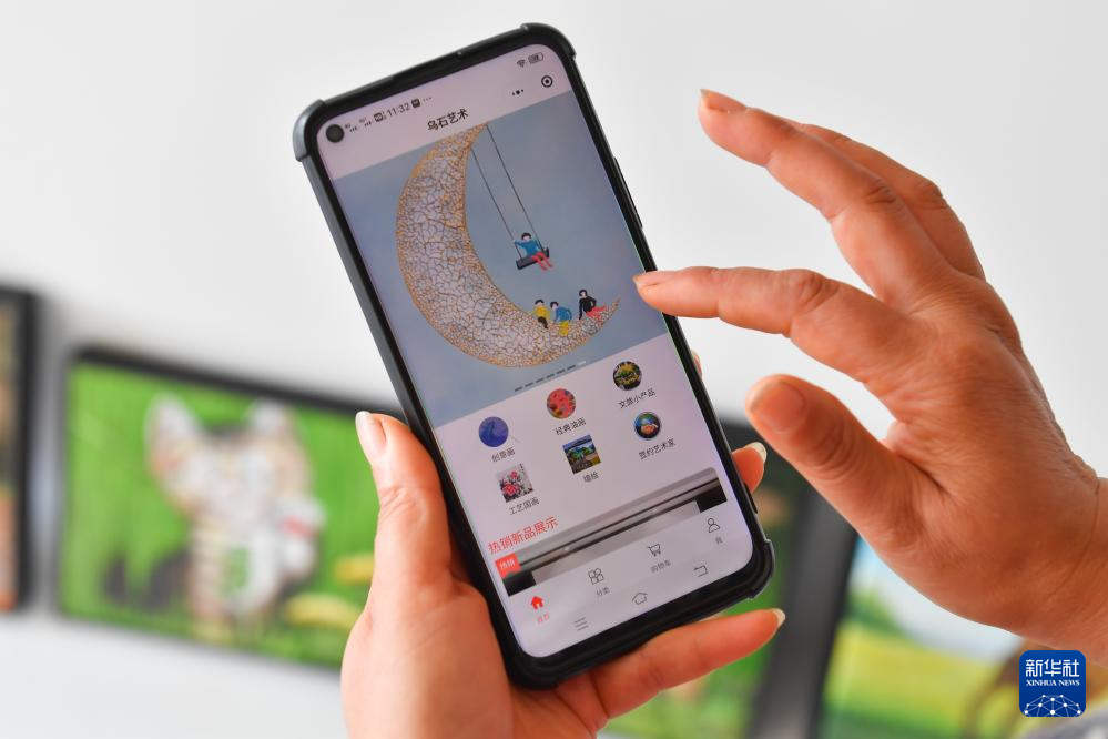 11月8日,在湖南省瀏陽市小河鄉烏石村的烏石當代藝術館,農民演示如何通過“烏石藝術”小程序購買油畫.