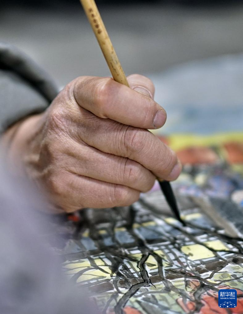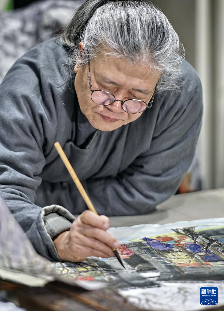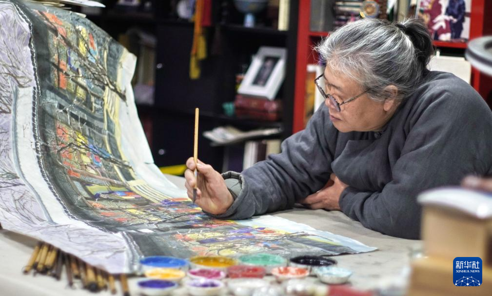 楊信在用傳統繪畫顏料進行創作(1月4日攝)。