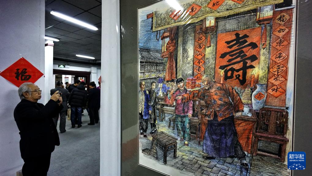 市民觀看展出的楊信根據老舍先生的文學作品手繪的“老北京”風情畫(2017年1月20日攝)。