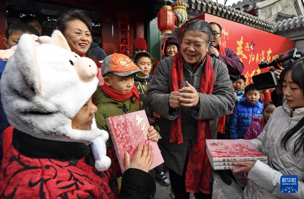 楊信給北京居民贈送他的手繪老北京民俗書籍《年味兒》(2019年2月3日攝)。
