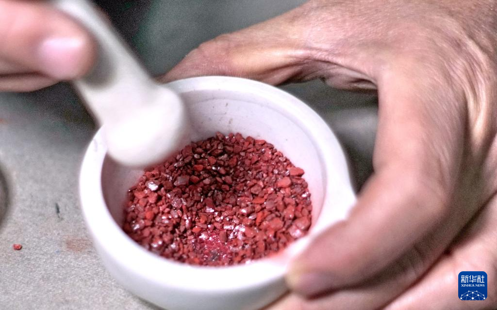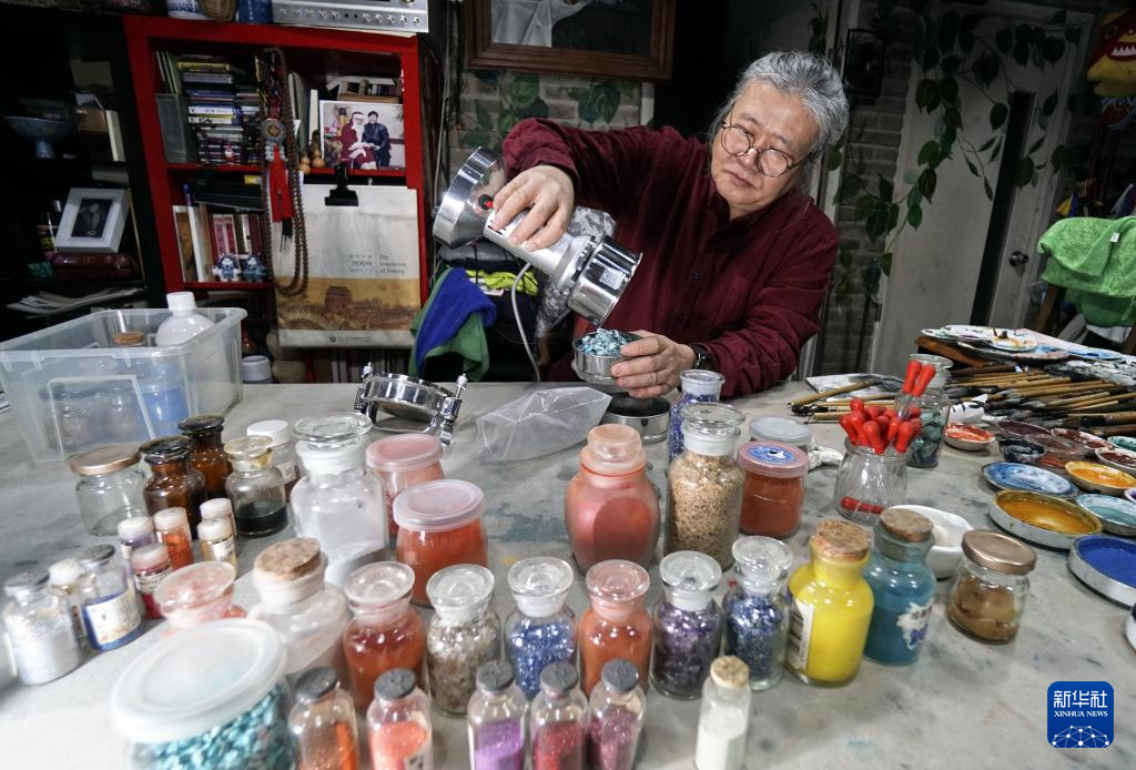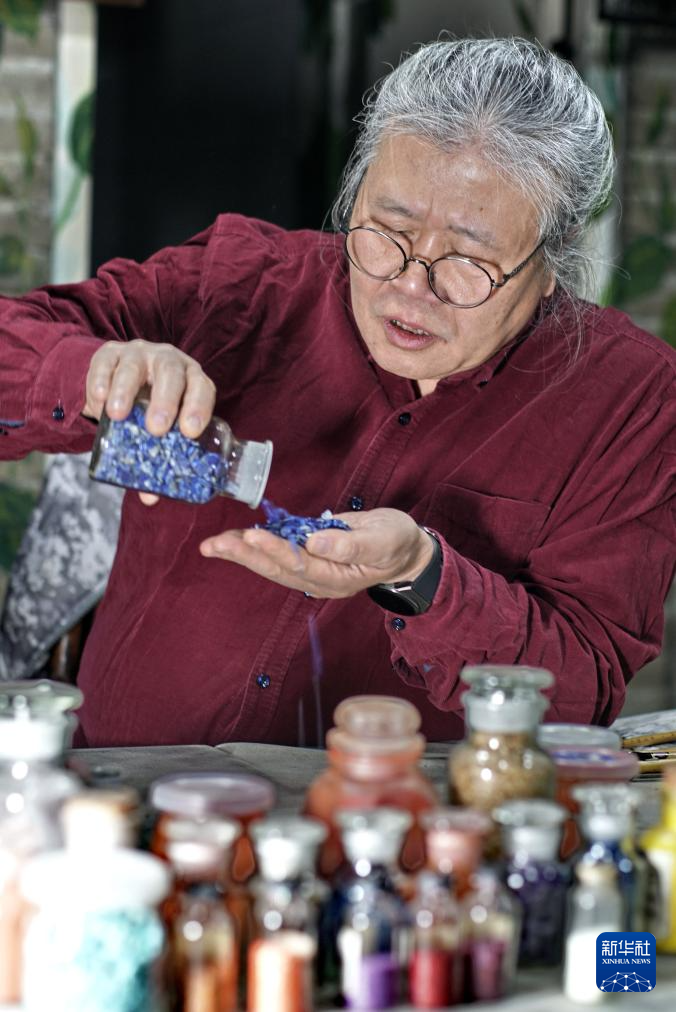 楊信用有色礦石磨制傳統繪畫顏料粉(1月4日攝)。