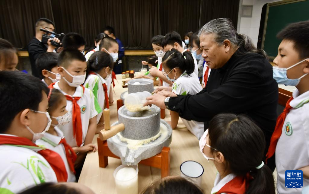 楊信在東城區東四九條小學為學生們講述老北京生活故事(2021年5月31日攝)。