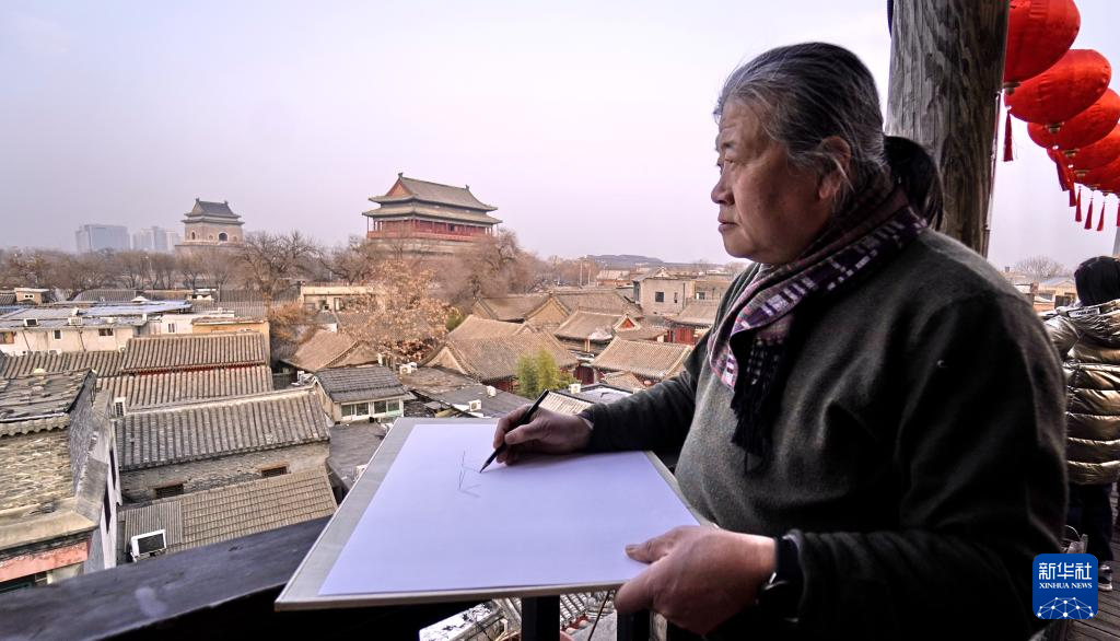 楊信(右)為來訪的繪畫愛好者介紹正在繪制的老北京風情作品(1月4日攝)。