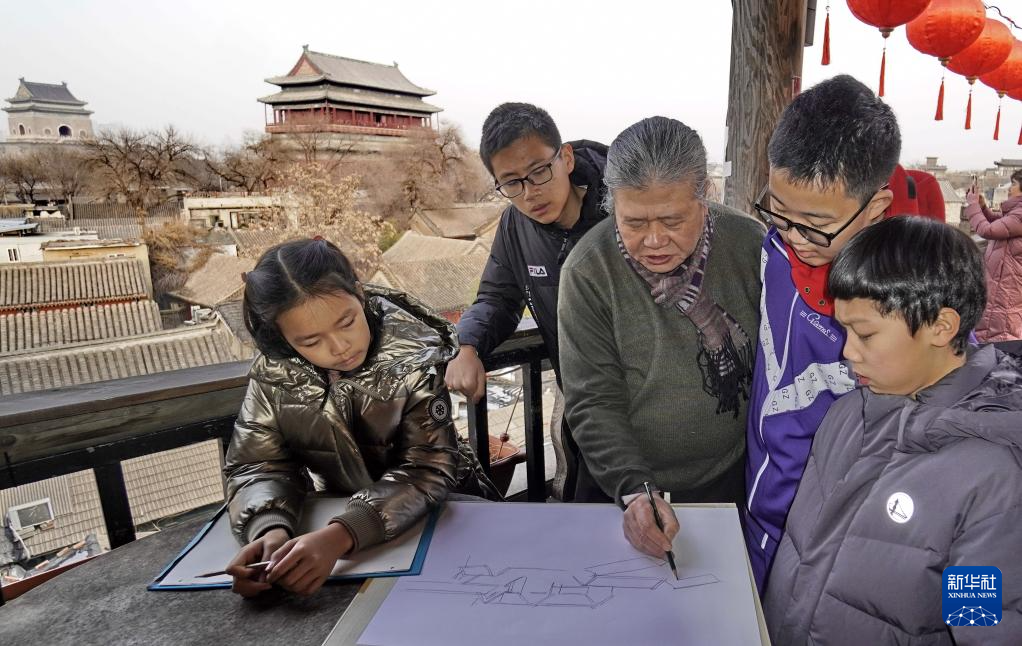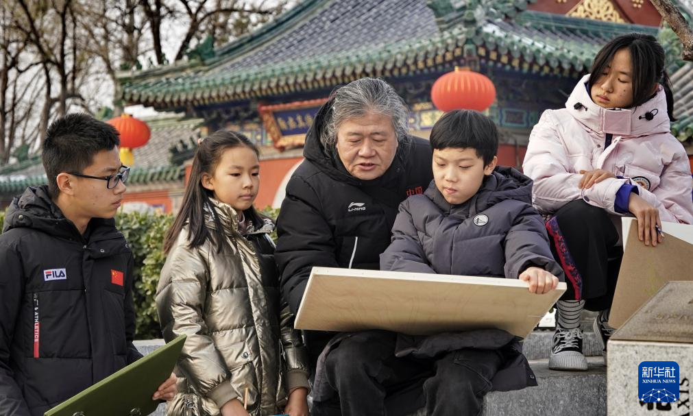 楊信(左三)在指導少年“京味繪畫”愛好者們進行戶外寫生(2023年12月30日攝)。