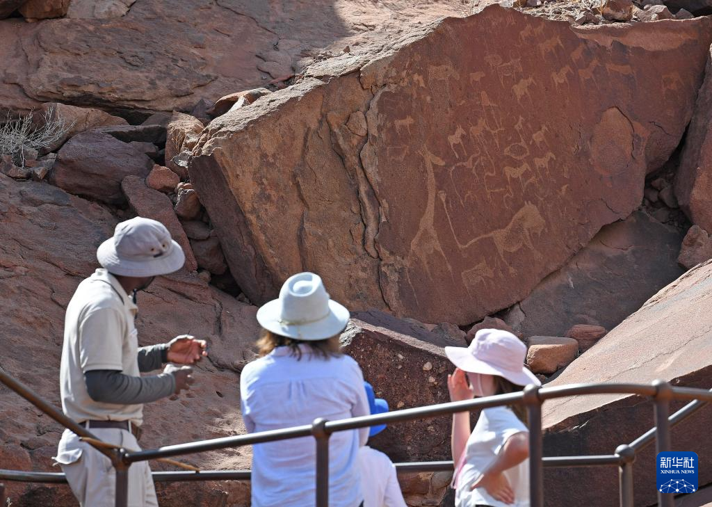 3月26日,在納米比亞庫內內省,游客欣賞頹廢方丹巖畫。
