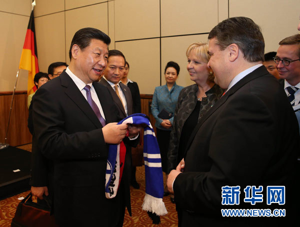??? 3月29日,中國國家主席習近平在杜塞爾多夫出席中德工商界舉行的招待會并發表題為《把握中國機遇,實現共同發展》的重要講話。這是招待會開始前,習近平在會見中德企業家代表時,德國副總理兼經濟和能源部長加布里爾(前右)向習近平贈送一家德國足球俱樂部球迷標志性圍巾。新華社記者劉衛兵攝