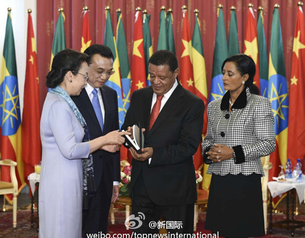 ??? 新華網北京5月6日電? 據新華社“新國際”微博報道,李克強總理與夫人程虹當地時間6日上午同埃塞總統穆拉圖夫婦在國家宮會見。會見后,程虹將自己的著作和譯著贈送給穆拉圖總統夫婦。