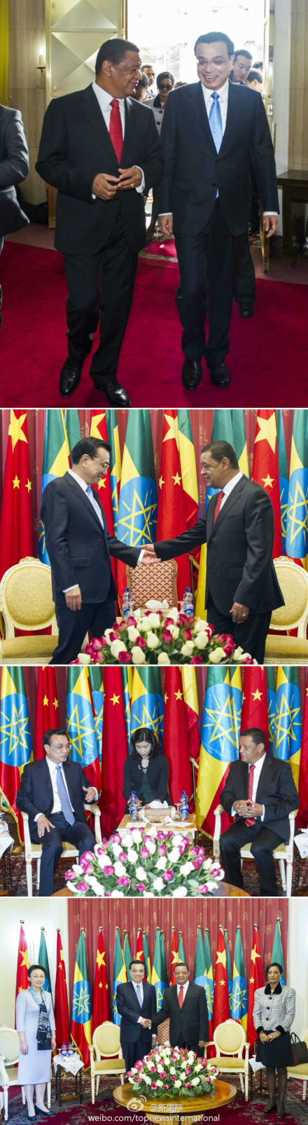 ??? 李克強與夫人程虹6日與埃塞俄比亞總統穆拉圖夫婦在總統官邸國家宮會見。李克強說,我們校友見面格外親切!總統先生在中國學習工作多年,為中埃、中非關系的發展作出了重要貢獻。穆拉圖總統曾在北京大學學習十余年,是李克強總理的校友,也是“中國通”。