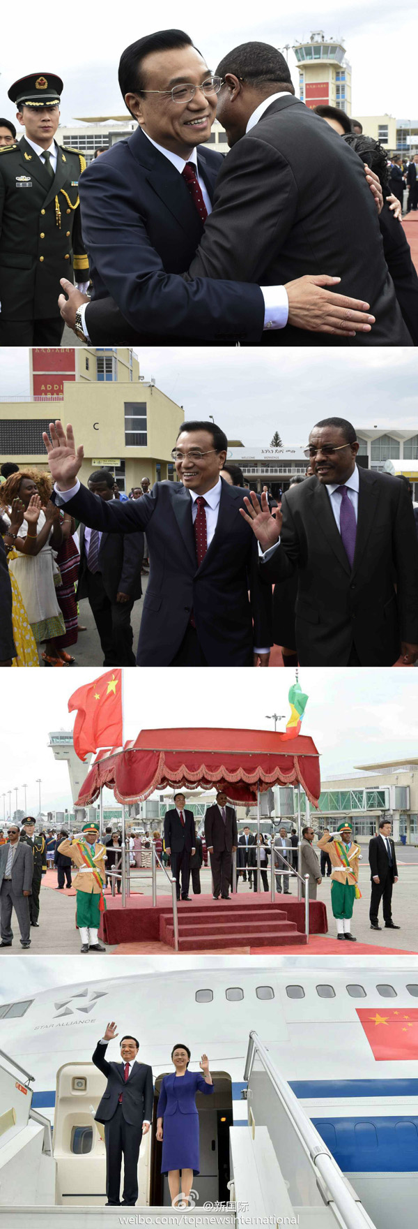 新華網北京5月7日電? 據新華社“新國際”微博報道,?當地時間6日下午,李克強總理結束對埃塞俄比亞和非盟總部的訪問,乘專機離開亞的斯亞貝巴飛赴此訪非洲的第二站尼日利亞。埃塞總理海爾馬里亞姆和夫人到機場歡送,并舉行了歡送儀式。身著民族服裝的當地民眾載歌載舞歡送中國貴賓。