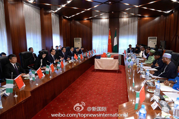 ????新華網北京5月8日電 據新華社“新國際”微博報道,李克強總理7日與尼日利亞總統喬納森會談。喬納森感謝李克強在尼安全形勢嚴峻的情況下如期到訪,是患難見真情。李克強表示中方將對尼提供各種支持和幫助,同時希望尼方切實加強對在尼中國公民的保護。目前中國在尼有6.5萬人,是我在非人員最多的國家之一。