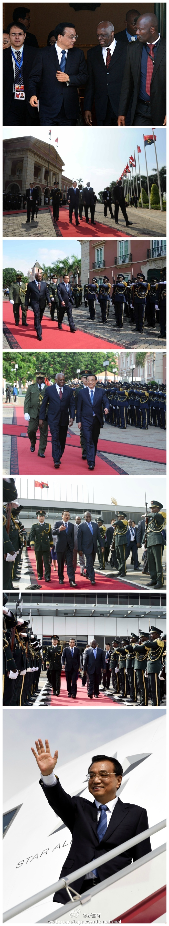 ????新華網北京5月10日電? 據新華社“新國際”微博報道,當地時間9日下午,李克強總理結束了在安哥拉的密集訪問行程,安總統多斯桑托斯夫婦在總統府為李克強夫婦舉行歡送儀式,安副總統維森特和外長??频俚綑C場為李克強夫婦送行。