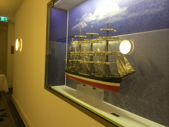 酒店布置得古香古色,每一層走廊兩側都裝飾有各種各樣與航海有關的物件——1900年的船長塑像、1903年的古老帆船、1930年的船舵……