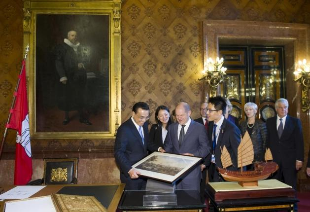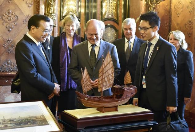 漢堡市政廳里,克強總理將一艘明代商船的復制模型,贈給漢堡市市長肖爾茨。