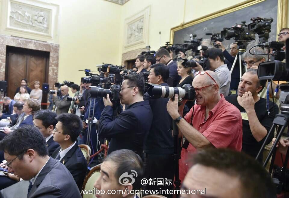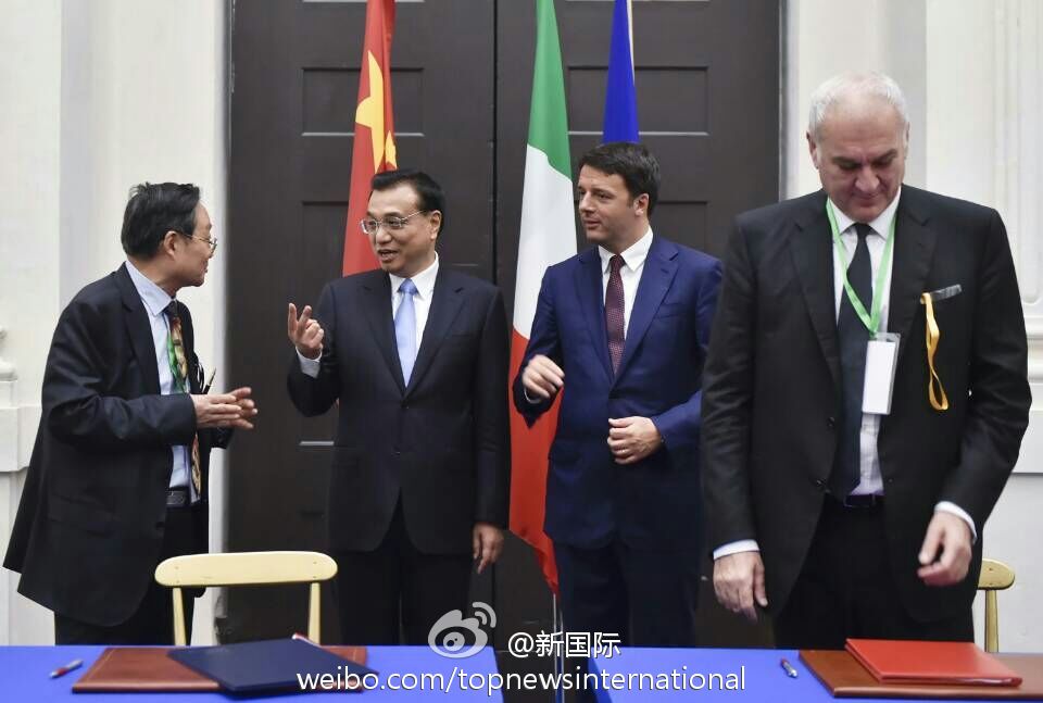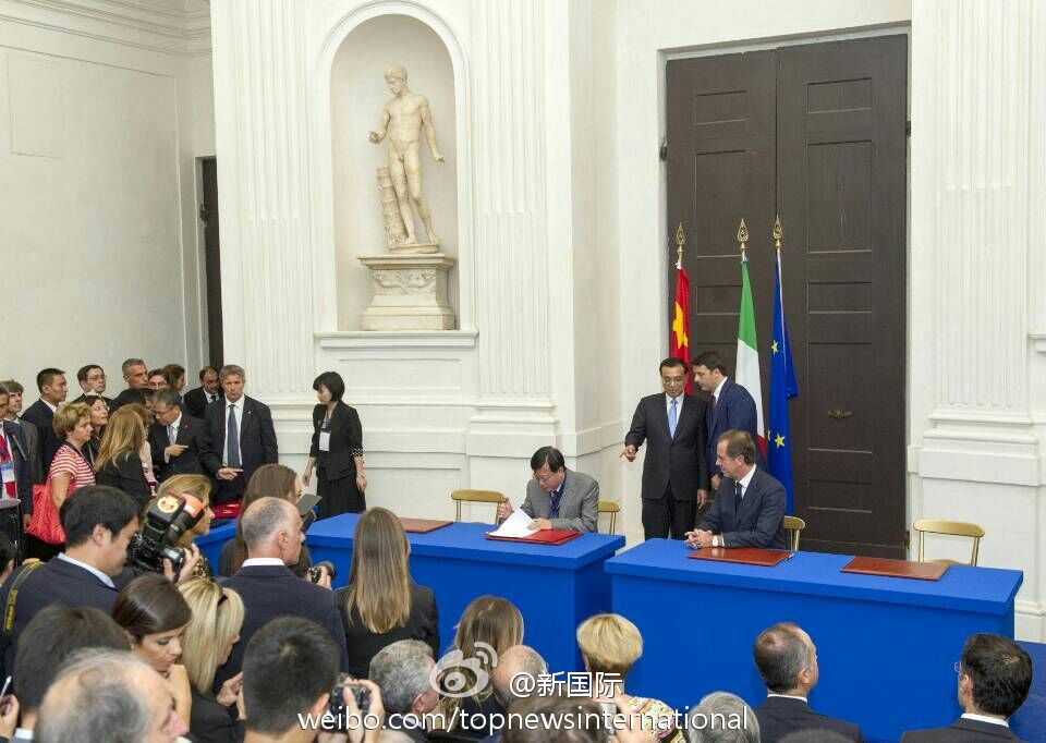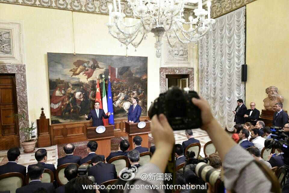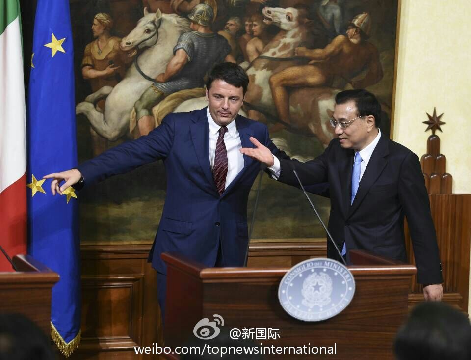 ??? 新華網北京10月15日電 據新華社“新國際”微博報道,國務院總理李克強14日與意大利總理倫齊在意總理府共同會見記者。李克強說,很高興來到不是一天建成的羅馬,中方不追求對意貿易順差,對擴大中意貿易合作規模充滿信心,愿與意方繼續深挖務實合作。即將簽署的協議規模高達80億歐元,這說明貿易投資規模還會擴大。?