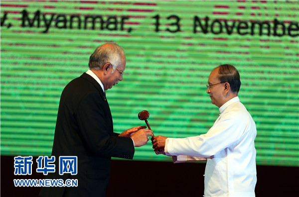 ????閉幕式上,馬來西亞總理納吉布從吳登盛手中接過象征東盟輪值主席國職權的金色木槌。馬來西亞將成為2015年東盟輪值主席國。