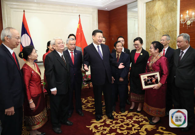 在萬象,習近平同奔舍那等家族友人親切見面、再敘友情,勉勵他們繼續投身中老友好事業。