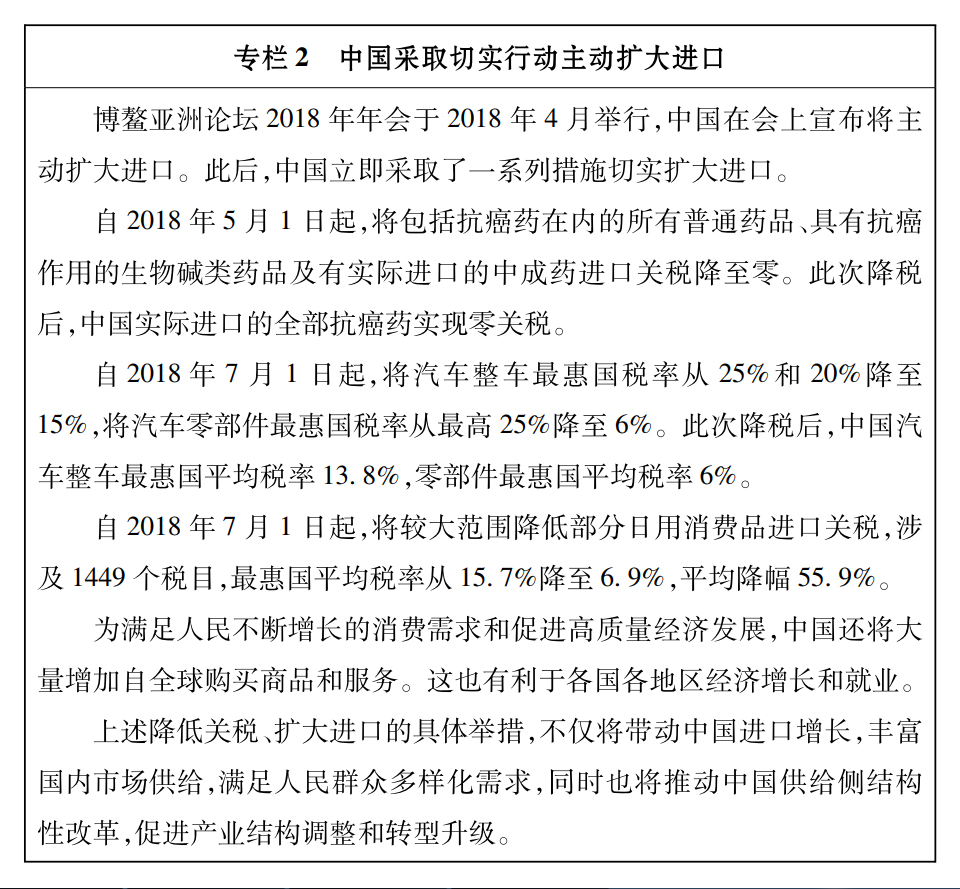 中國將繼續推進簡政、降稅、減費改革,繼續加強同國際經貿規則對接,增強透明度,強化產權保護,堅持依法辦事、鼓勵競爭、反對壟斷。加快制定出臺《外國投資法》,構建符合新時代改革開放需要的外資法律體系,推進更高水平的對外開放和更深層次的外資管理體系改革,保護外商投資和外國投資者合法權益。降低外國人才來華就業、創業門檻。提升各類開發區發展水平,高標準高質量建設自由貿易試驗區,探索建設中國特色自由貿易港。