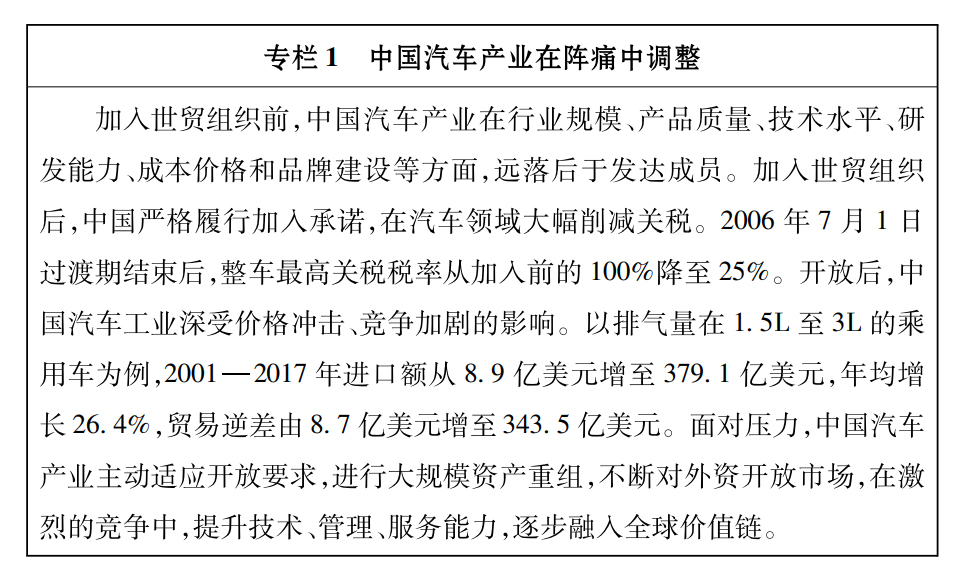 中國在加入世貿組織時作出廣泛而深入的開放承諾,國內企業直接面對國際競爭,多數產業面臨較大困難。中國企業主動應對挑戰,大力推進產業結構調整,積極參與全球價值鏈,國際競爭力明顯提升。