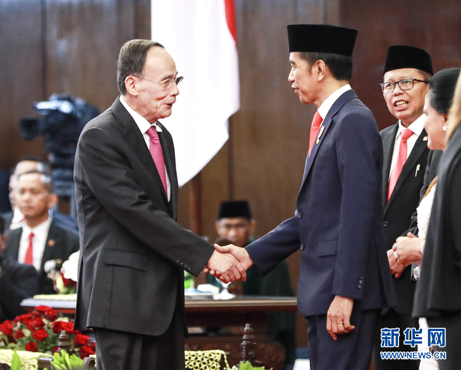 這是10月20日,王岐山在佐科總統連任就職儀式上向佐科致賀。 新華社記者龐興雷攝