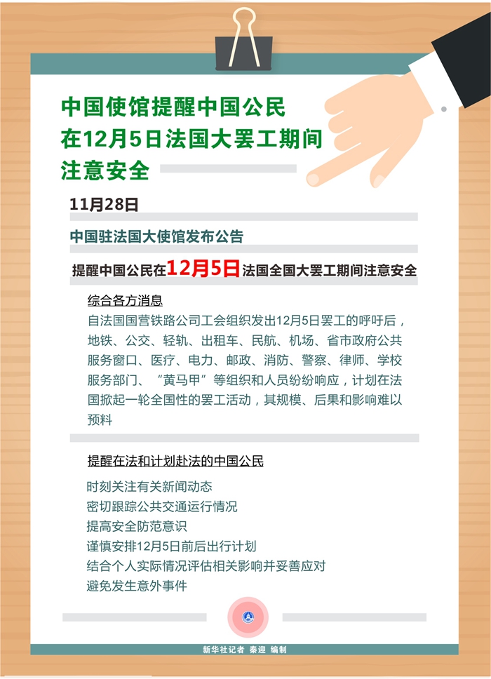 新華社巴黎11月28日電(記者劉金輝)中國駐法國大使館28日發布公告,提醒中國公民在12月5日法國全國大罷工期間注意安全。